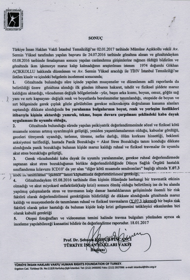 Adli Tıp Uzmanı Şebnem Korur Fincancı imzasını taşıyan rapora göre Gökhan Açıkkollu, işkenceye ve şeker ilaçlarının verilmemesi gibi bir dizi nedenden dolayı nezarethanede kalp krizi geçirdi.