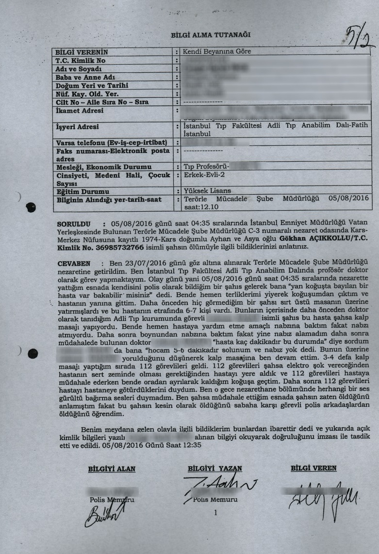 GÖKHAN AÇIKKOLLU’YA KALP MASAJI YAPAN VE ÖLÜMÜNE TANIKLIK EDEN ADLİ TIP UZMANI PROFESÖRÜN İFADESİ