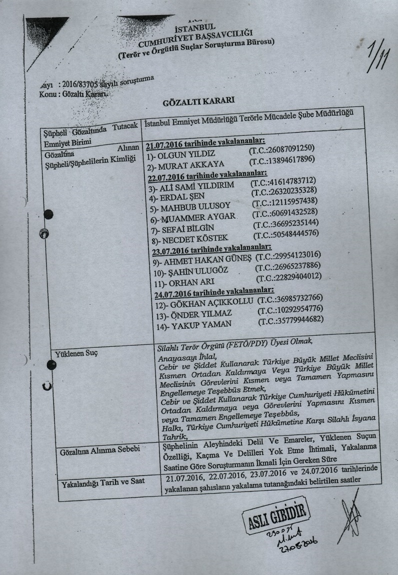 Bu korkuları yaşarken eşimin vefatından 6 ay sonra, oğlumun üniversite sınavına 2 hafta kala, 24 Şubat 2017 tarihinde sabah saatlerinde evimize polisler geldi ve gözaltına alındım. Gözaltı kararı veren savcı eşimi gözaltına aldıran Can Tuncay’dı. Bana eşimin dosyası ile ilgili sorular sordu. Tanıdığım, bildiğim kişileri söylememi, isim vermemi istedi. Ben de isim vermeyince “Hiç yardımcı olmuyorsun, seni tutuklayacaktım ama yaşlı anne ve babanla beraber yaşıyormuşsun onun için seni serbest bırakıyorum.” dedi. Savcıya ‘Allah’ın adaletine güvenim sonsuz. Burada olmazsa Allah ahirette karşımıza çıkaracak ve hiçbirine hakkımı helal etmiyorum’ dedim. Bir ay sonra da evime yurtdışı yasağı konduğuna dair bir evrak gönderdi.