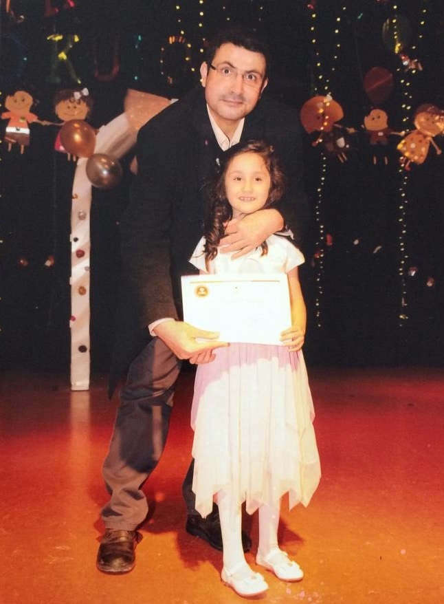 | Gökhan Açıkkollu, kızı Zeynep Munise ile birlikte okuma bayramında, Mayıs 2016 |