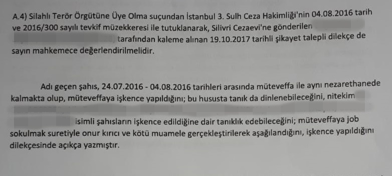 Ayrıca 28 Temmuz 2016’da eşim yine şeker krizine girmiş, Haseki Hastanesi’ne götürülmüş ve 4 saat hastanede kaldıktan sonra tedavisi devam etmesi gerekirken nezarethaneye geri getirilmiş. Vefat ettiği gün yine sorgulanmak üzere götürülmüş ve yine işkence uygulanmış. Akşam nezarethaneye geri getirildiğinde göğsünü tutarak gelmiş ve göğsünün çok ağrıdığını söylemiş.